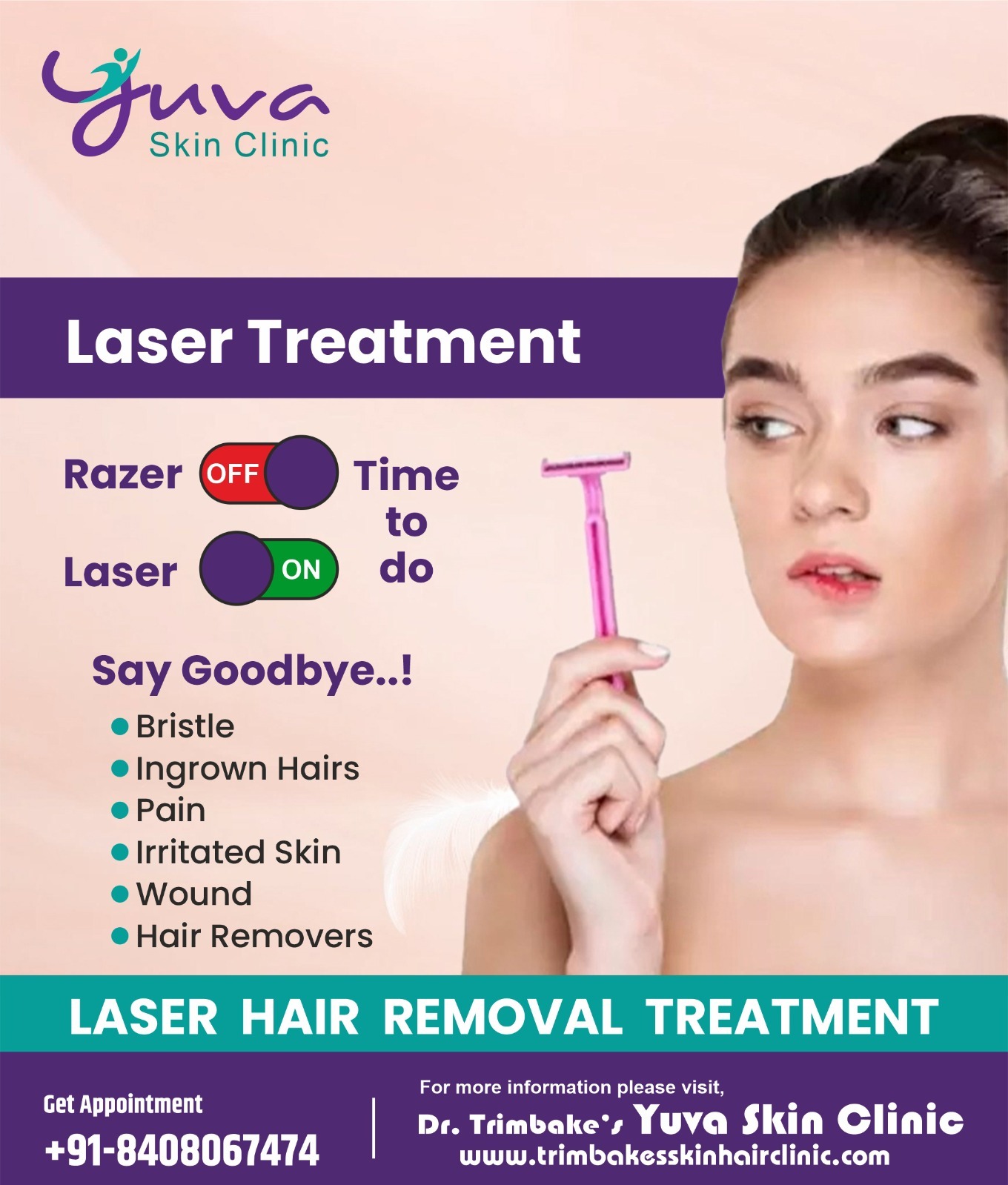 having, plucking, waxing ... all of these take time, but for people who prefer to have smooth, hairless skin, they may seem like the only options available... LASER HAIR REMOVAL. This high-tech method uses light to actually destroy the follicle, leaving you with fuzz-free skin. Laser hair removal is a gentle and effective way to permanently reduce unwanted hair from virtually any area of the body. Any service with the word 'laser' in its name might seem intimidating, but it's actually very simple. 'Energy from the laser is picked up by the pigment in the hair follicle, causing destruction to the root.' For more information and treatment please visit, Trimbake's Yuva Skin Clinic 'Yashwant' Budhawar Peth, Near cottage hospital, Station road, Karad. 415110. J…