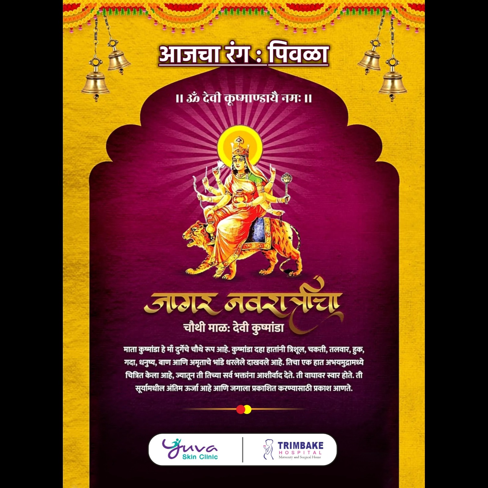 नवरात्रीचे नऊ रंग 2025 – पिवळा दिवस चौथा रंग - पिवळा नवरात्रीचे नऊ रंग 2025 मध्ये नवरात्रीच्या विशेष रंगांच्या यादीमधील चौथा रंग आहे पिवळा रंग. नवरात्रीच्या चौथ्या दिवशी #कुष्मांडा_देवीची_पूजा केली जाते.या दिवशी तुम्हाला आयुष्यात अतुलनीय आनंदाची अनुभूती मिळेल त्याचबरोबर तुमच्या आयुष्यात भरपूर समृद्धी आणि भरभराट प्राप्त होईल.