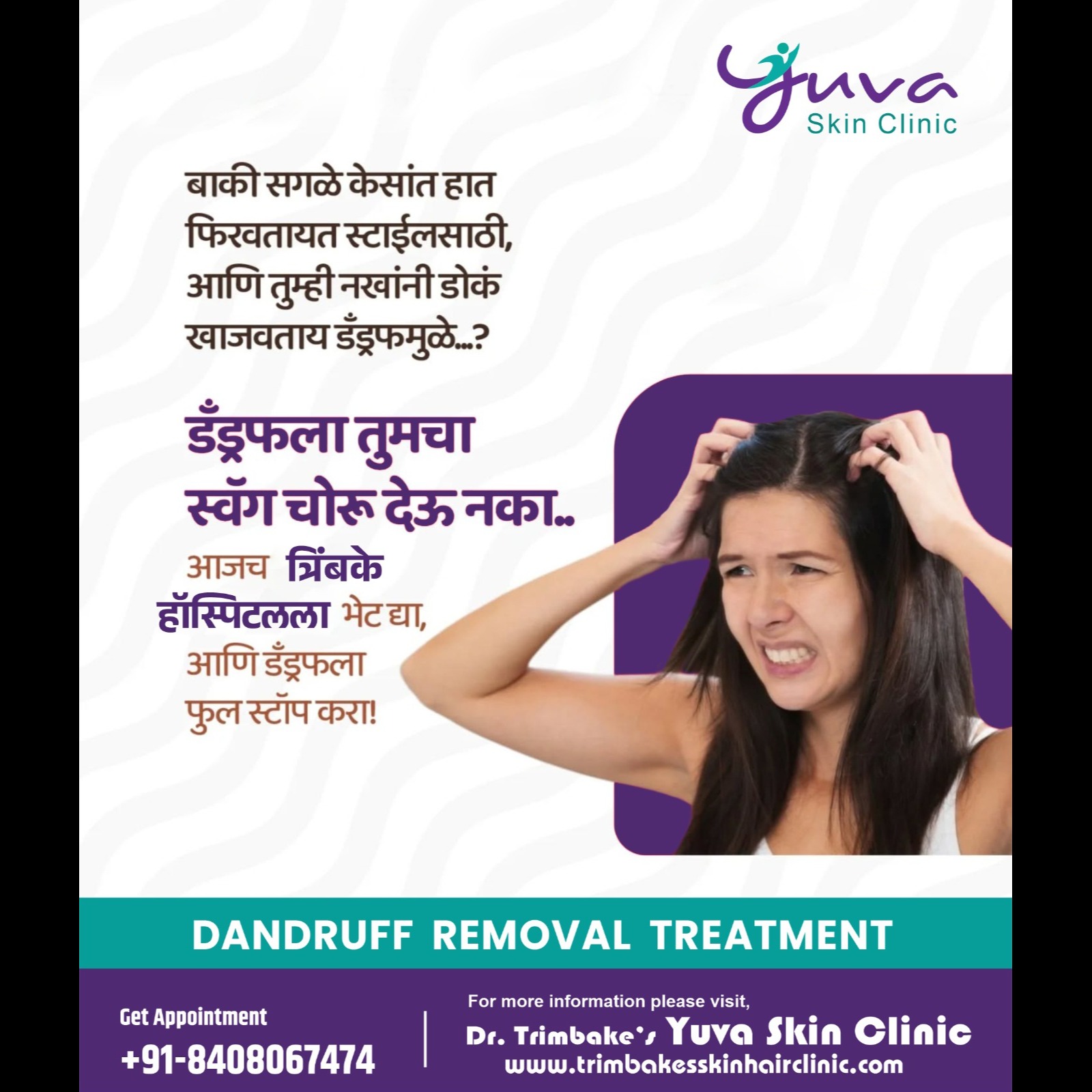 Dandruff is the excess shedding of the top layer of the skin on the scalp, eyebrows or along the sides of the nose. Those unpleasant white flakes on the collar of your dark shirt or blouse are dandruff. Dandruff is a sign that the skin of the scalp is peeling off (exfoliating). It is perfectly normal for the skin to exfoliate. The problem arises when the amount of dandruff becomes an eyesore. There are basically two reasons for this. Too much production or not effective removal. But dont worry now, we have a effective solution for it.. For more information meet our expert... Trimbake's Yuva Skin Clinic 'Yashwant' Budhawar Peth, Near cottage hospital, Station road, Karad. 415110. Just book a quick appointment with us call on 084080 67474 #dandruff #skincar…