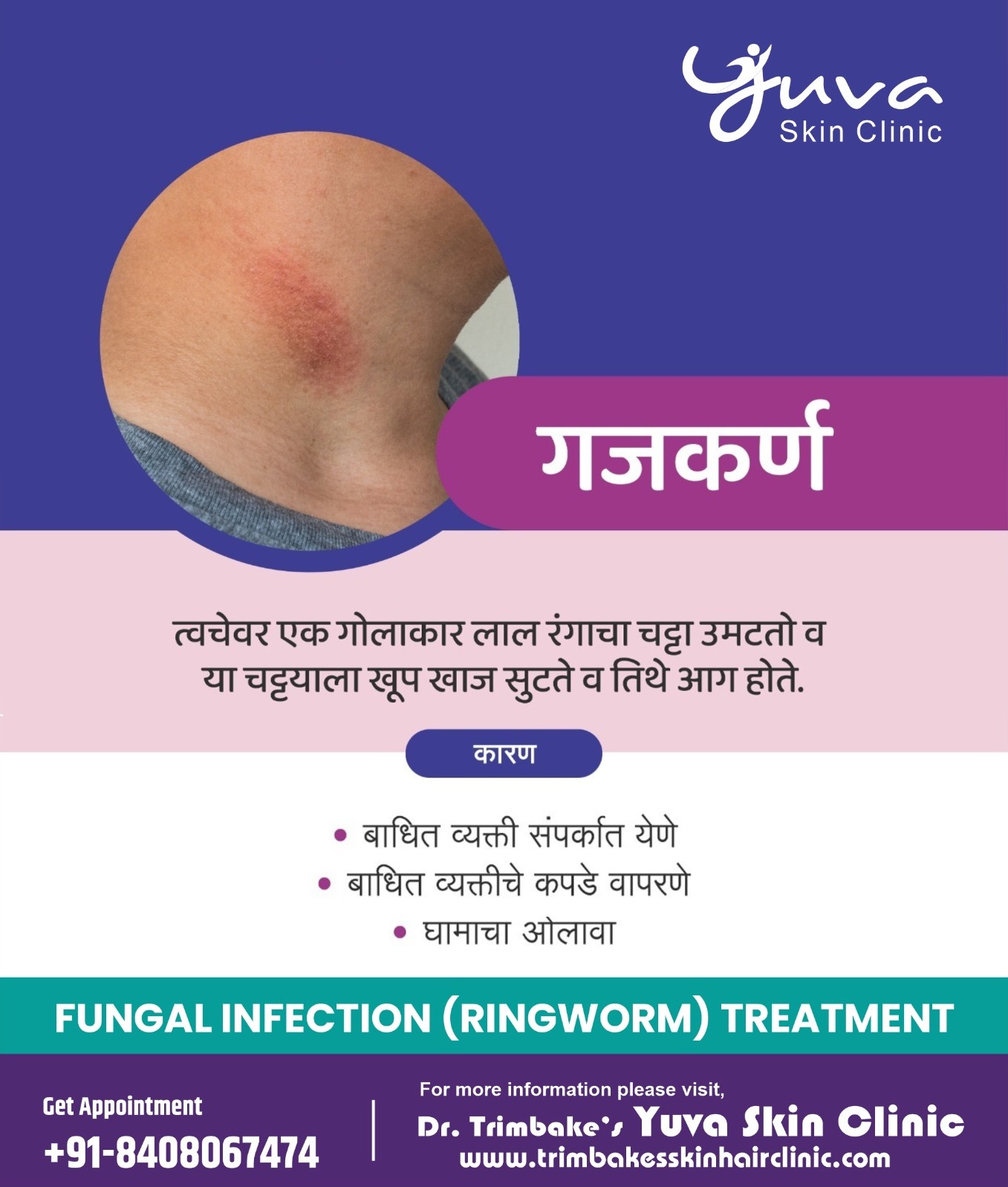 गजकर्ण किंवा फंगल इन्फेक्शन.. 🔸 सतत खाज 🔸 त्वचेवर लालसर चट्टे 🔸 गोलाकार किंवा इतर आकारात डाग 🔸 क...