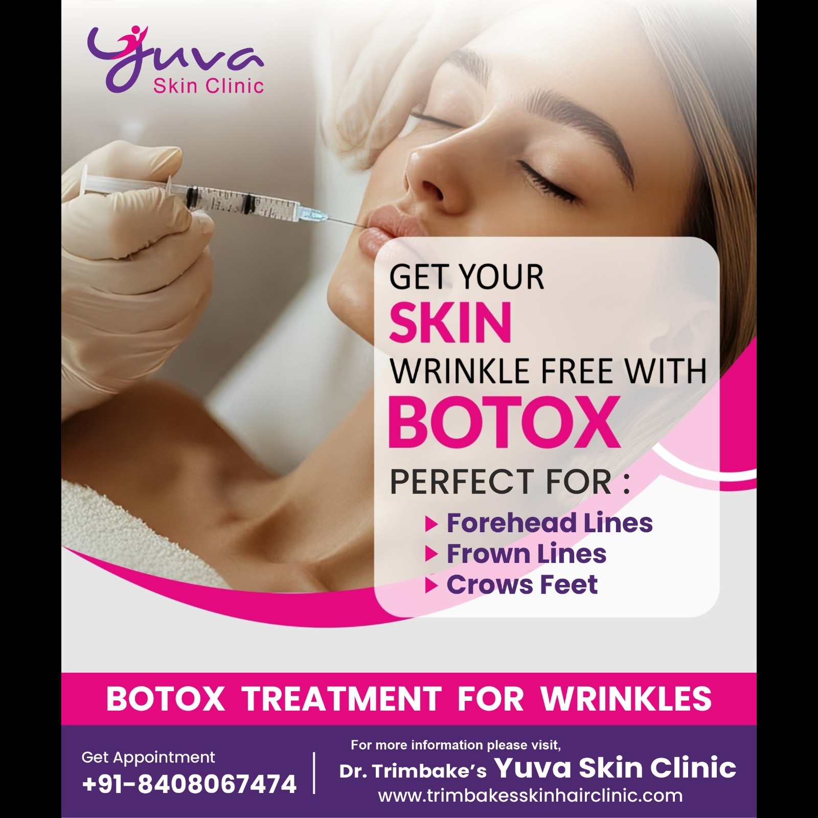 Say Goodbye to Wrinkles with Botox! ✨ Achieve smooth, youthful skin by targeting those stubborn forehead lines, frown lines, and crow’s feet. 🌟 Trust Yuva Skin Clinic for expert Botox treatments that will leave you feeling rejuvenated and confident! 💉 📞 Book your appointment now..! For more information meet our expert.... Trimbake's Yuva Skin Clinic 'Yashwant' Budhawar Peth, Near cottage hospital, Station road, Karad. 415110. Just book a quick appointment with us call on 084080 67474