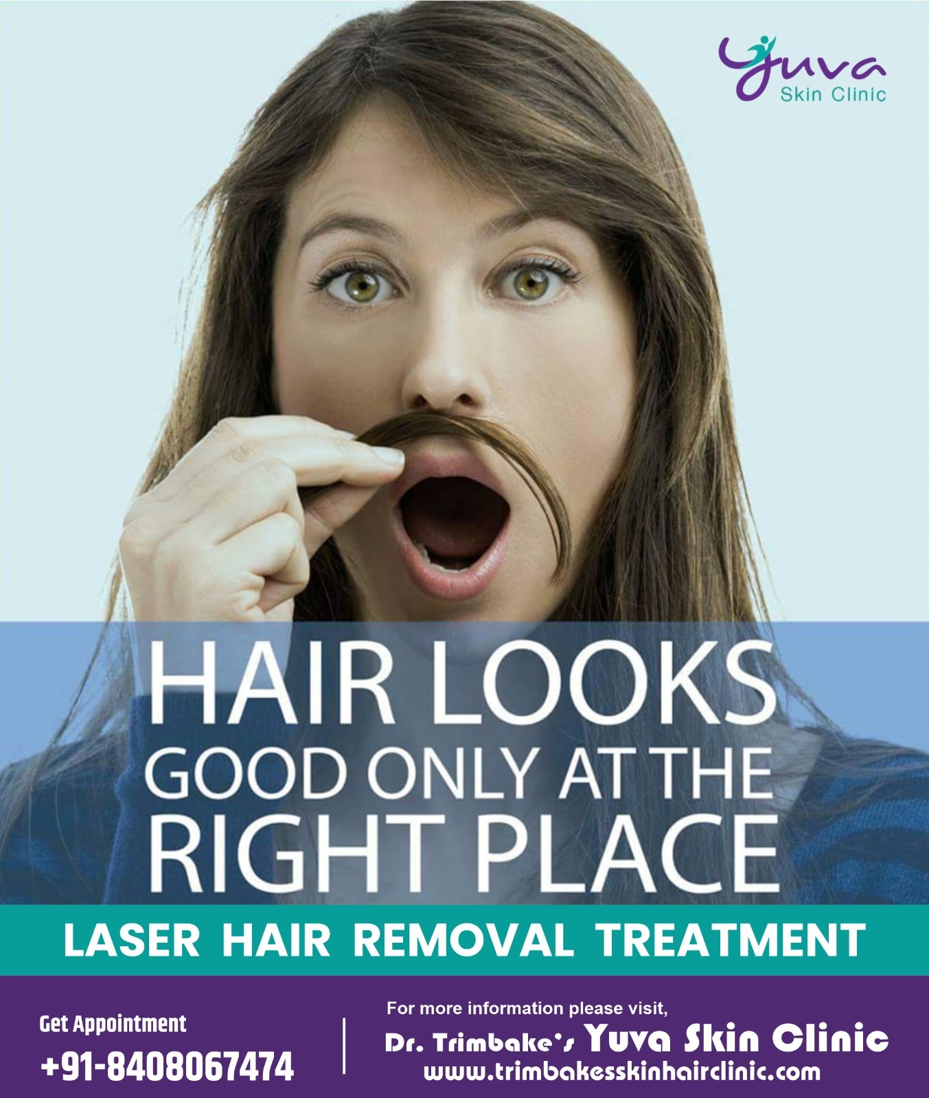 Smooth, silky and flawless skin is the dream of every woman. Unwanted or excess hair is the biggest problem in realizing this beautiful dream. Unwanted hair is common on the upper lip, chin, cheeks, back, legs, fingers, lower abdomen, bikini line, feet, and toes. But now we have a best and economical solution for it..... LASER HAIR REMOVAL TREATMENT.. For more information meet our expert... Trimbake's Yuva Skin Clinic 'Yashwant' Budhawar Peth, Near cottage hospital, Station road, Karad. 415110. Just book a quick appointment with us call on 084080 67474